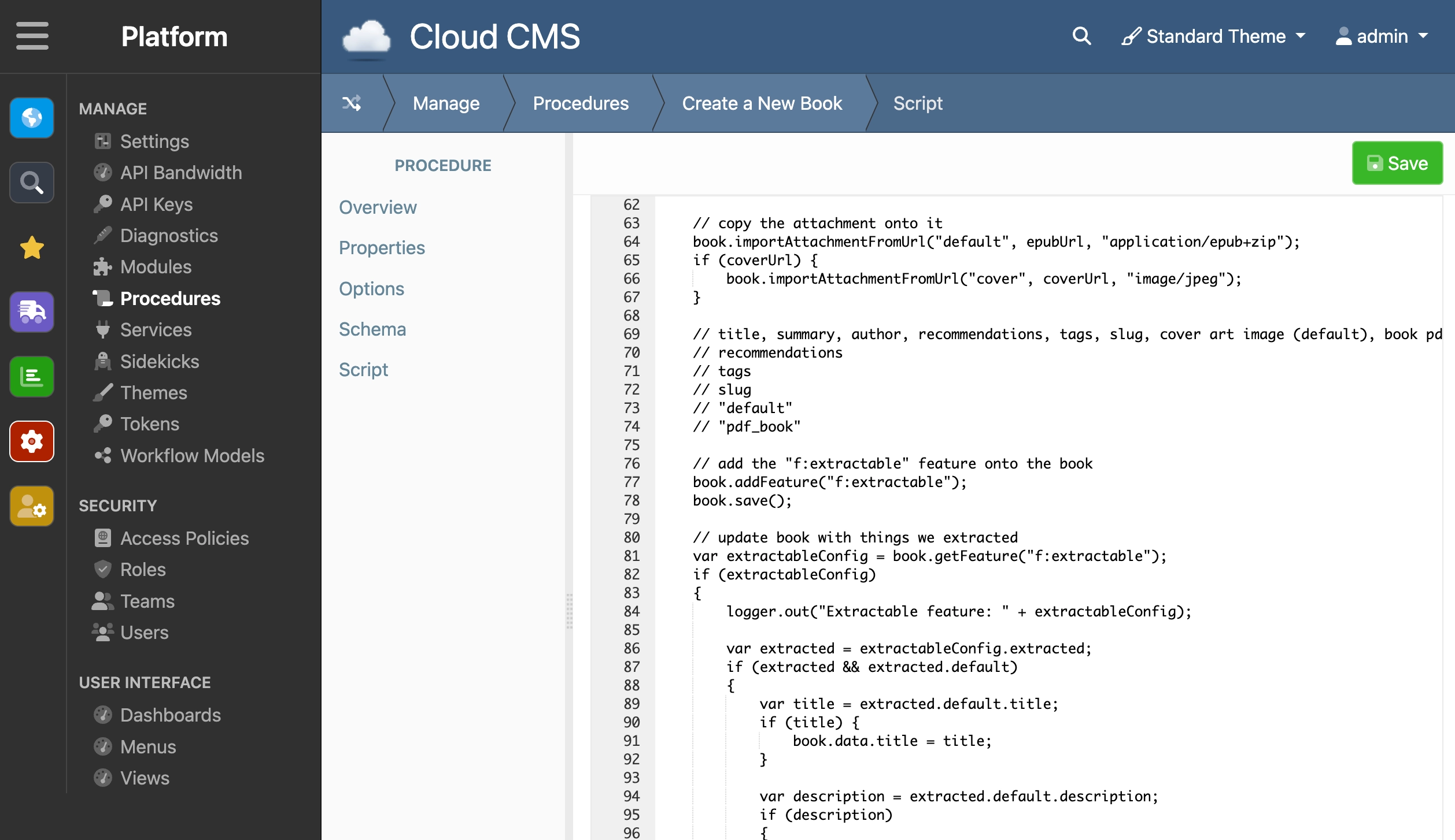 Develop parameterized stored procedures using server-side JavaScript and JSON Schema. Procedures provide scriptable implementations of complex, multi-step worker tasks that can be executed by editorial users or automated Sidekick assistants.