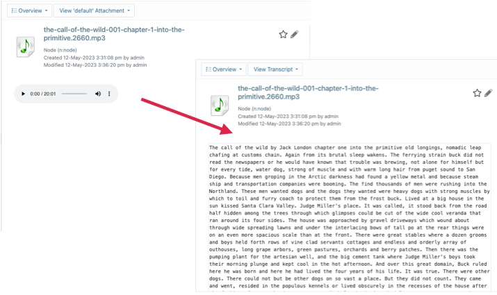 Support for a diversity of audio formats. Audio is processed on the fly and text transcriptions are produced and applied to your content instance as JSON.