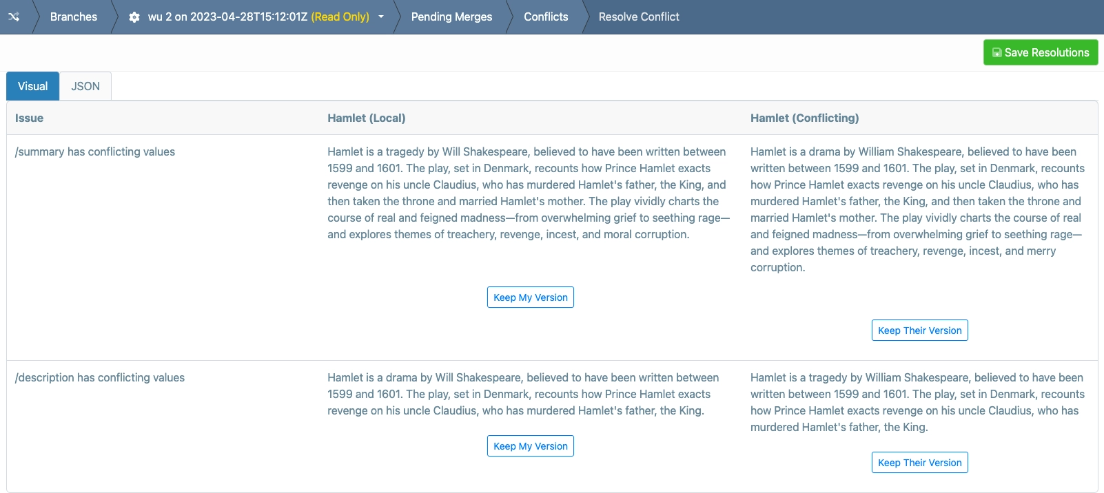 Gitana provides tools to allow Users to work in their own workspace and not conflict with other users/teams. However, a conflict may occur when merging your changes back to the Master Branch if the same content has been updated and merged back to Master from another release. Not to worry.. this is a complex problem which Gitana provides options and solutions for: