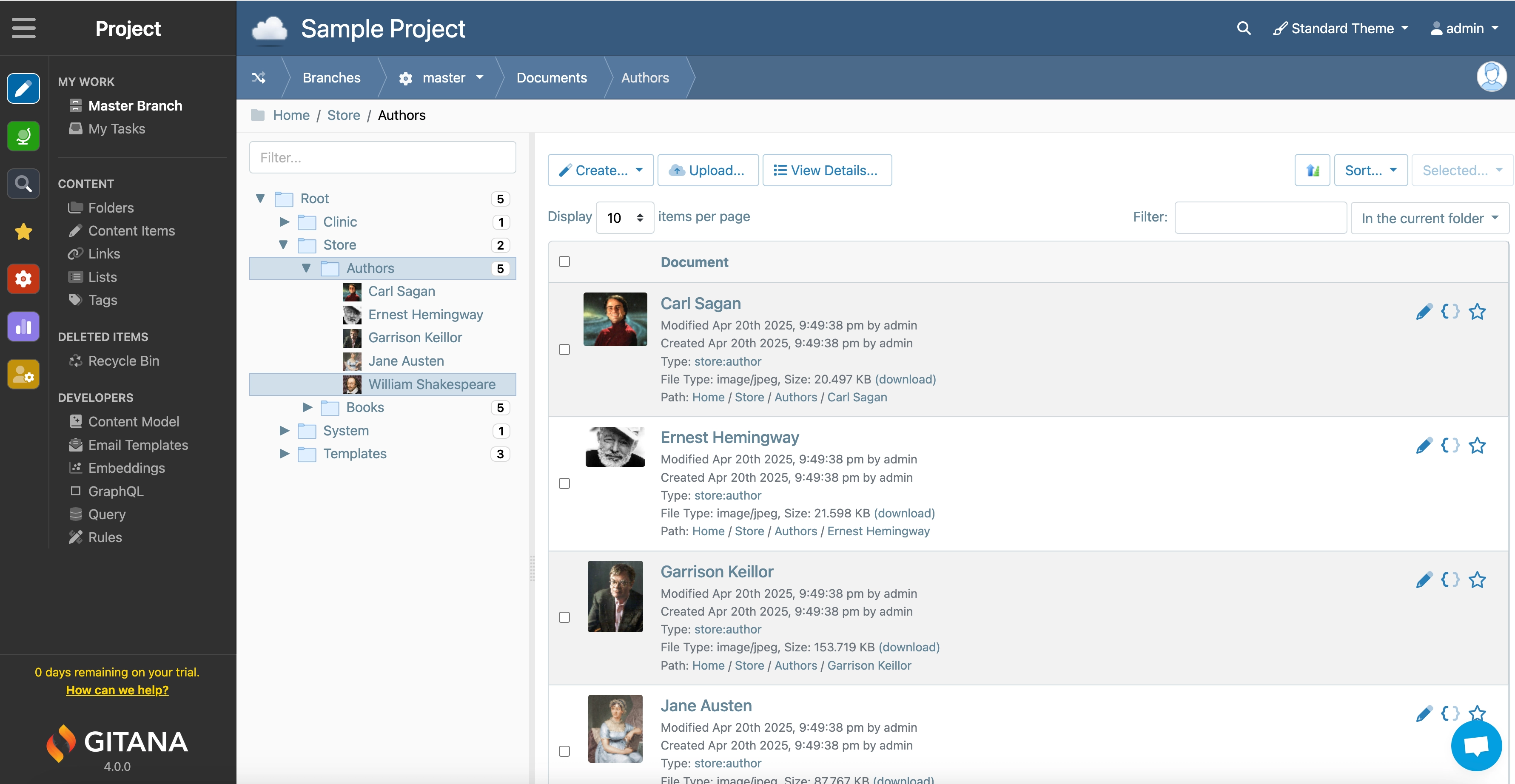 The Sample Project is often used as a starting point for extending for purposes of a Proof-of-Concept (POC) or as a way to get a general idea of what Gitana is all about.