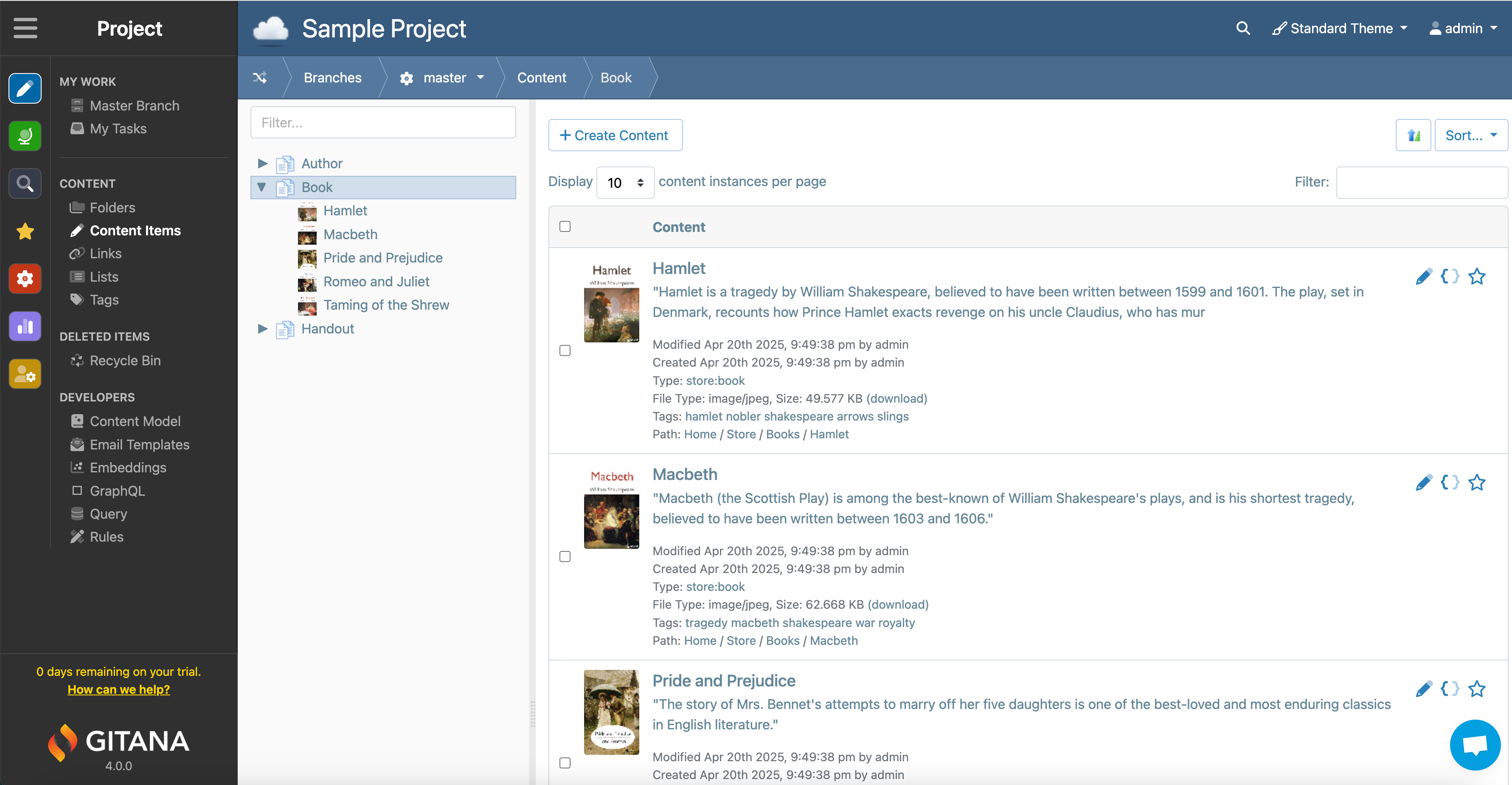The Sample Project comes pre-populated with a bunch of interesting content types for things like Books, Products, Authors and more.