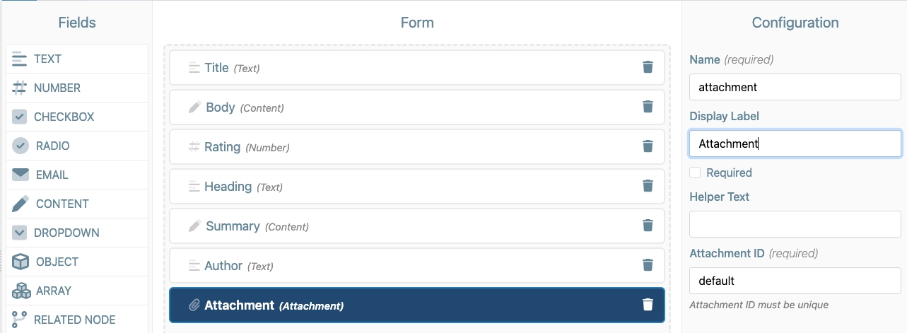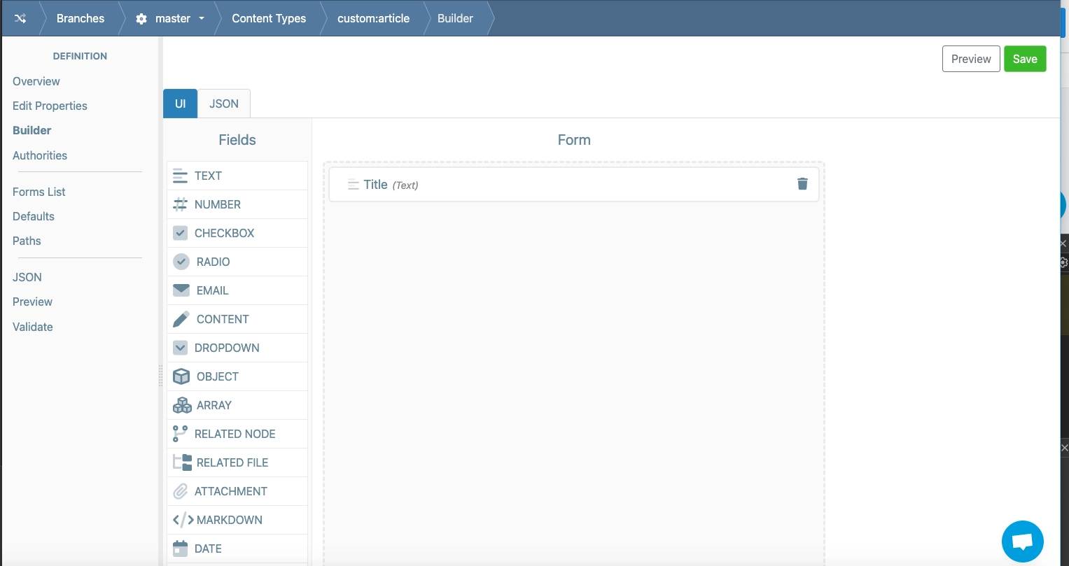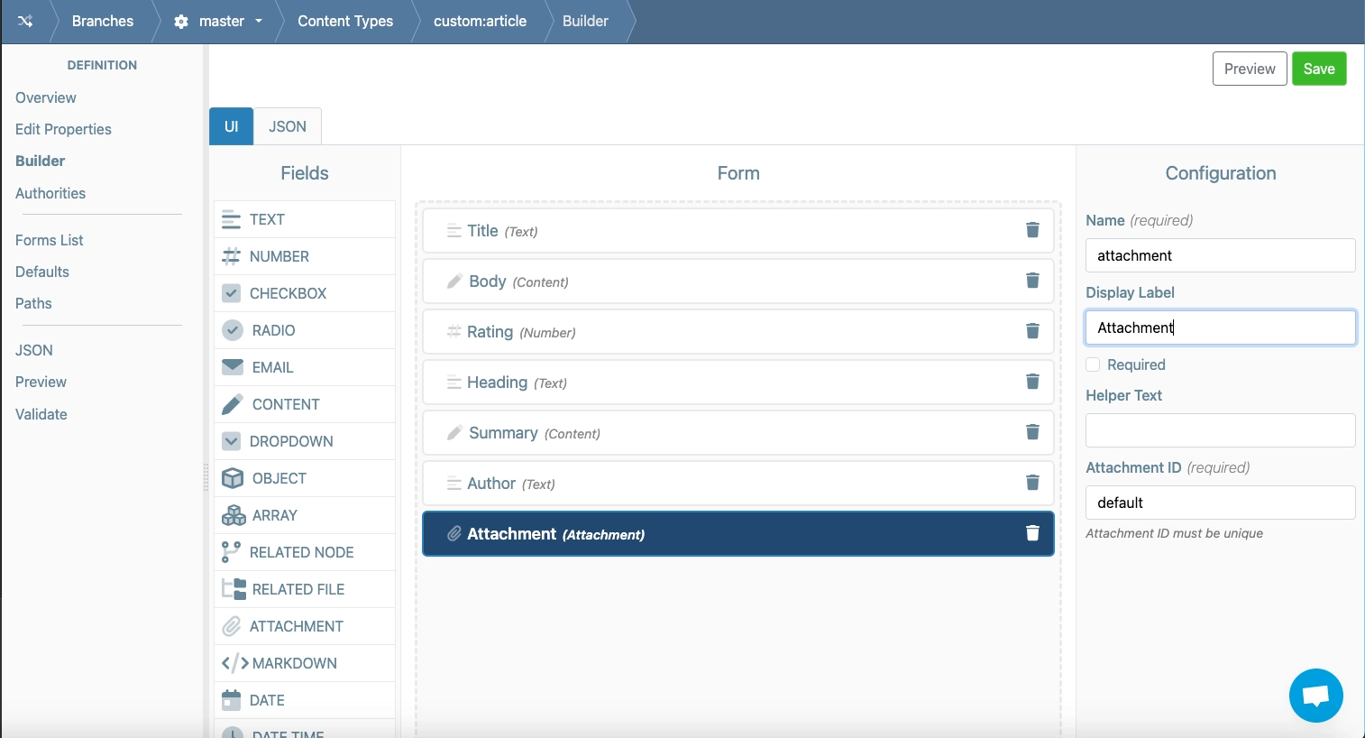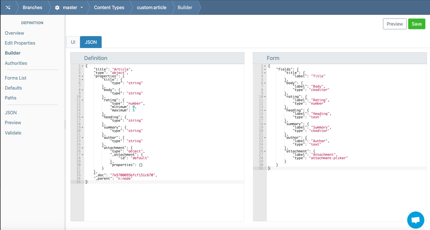 The Content Model Builder makes the experience of creating the content models very user-friendly and quick. You can add and remove various fields just by dragging and dropping. It automatically generates the correct JSON for you to use.